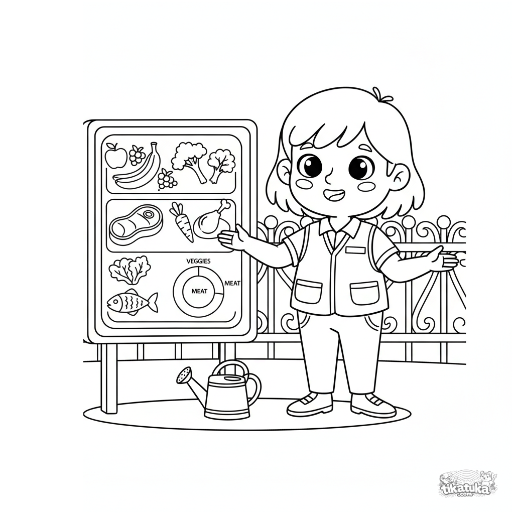 Раскраска для детей 4-6 лет: смотритель зоопарка объясняет рацион животных у информационной таблички. Образовательная сцена о профессиях и питании.