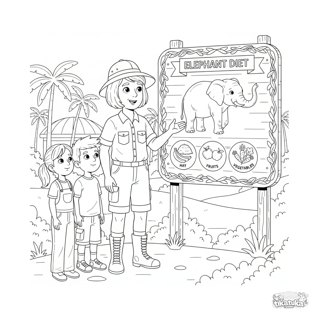 Раскраска для детей 10-12 лет: смотритель зоопарка объясняет табличку о рационе слона. Детализированное образовательное изображение о профессиях и биологии.