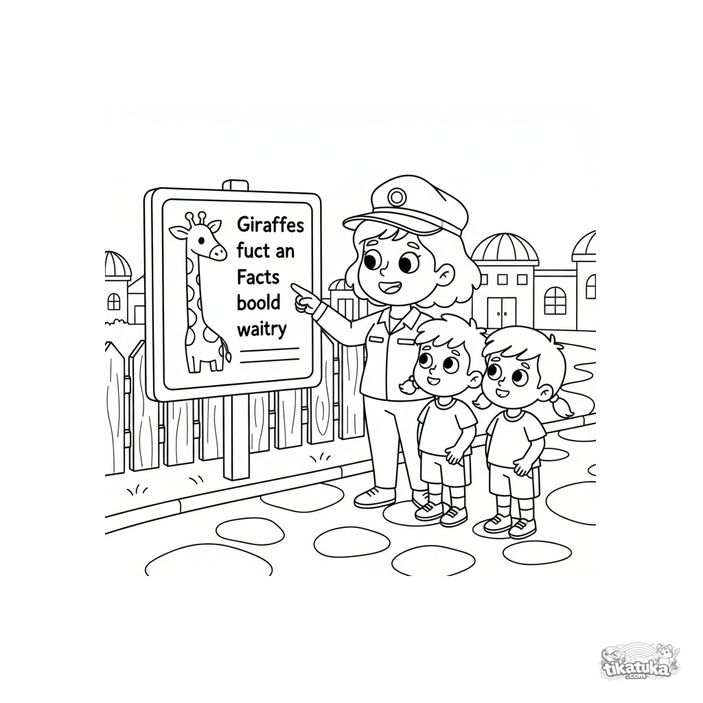 Раскраска для детей 4-6 лет: смотритель зоопарка объясняет детям информацию у таблички с жирафом. Образовательная сцена о профессиях и животных.
