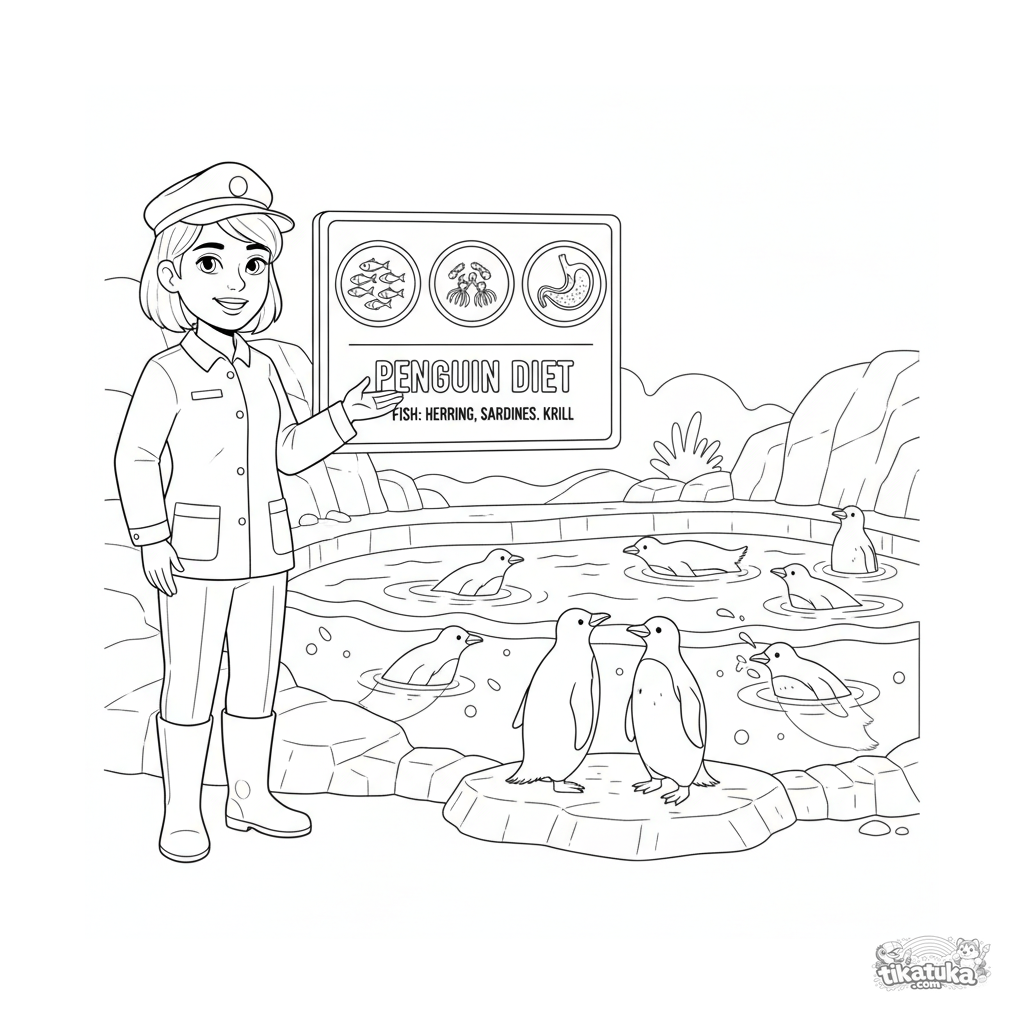Детальная раскраска для детей 10-12 лет: смотритель зоопарка объясняет рацион пингвинов у информационного стенда. Образовательная сцена с реалистичными деталями.