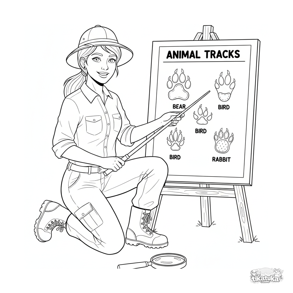 Раскраска для детей 10-12 лет: зоолог у информационного стенда в зоопарке объясняет таблицу со следами разных животных. Детализированное научно-познавательное изображение.