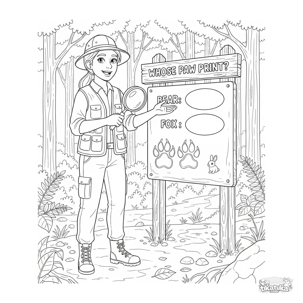 Детальная раскраска для детей 10-12 лет: зоолог у образовательного стенда со следами животных в зоопарке. Познавательная сцена о природе.