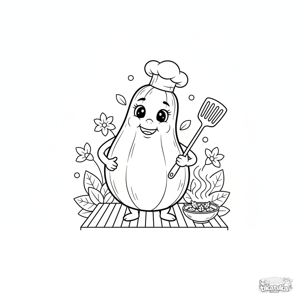 Раскраска для детей 4-6 лет: улыбающийся кабачок в колпаке повара готовит на садовом гриле. Простые формы, летняя тема.