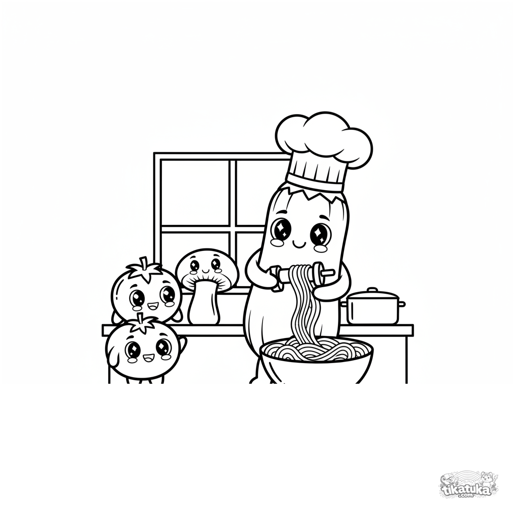 Раскраска для детей 4-6 лет: весёлый цуккини в колпаке шефа делает из себя лапшу на кухне. Современный плоский векторный стиль.