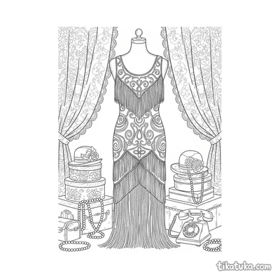 В разделе раскрасок про 1920-е годы вы найдете сцены с платьями флэпперш на вечеринках, в спикизи и бальных залах. Есть рисунки с манекенами в витринах, закулисные моменты подиума и интерьеры спален той эпохи. Все сюжеты основаны на характерных деталях и атмосфере времени.