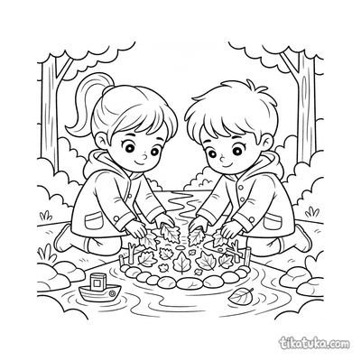 Друзья строят плотину из листьев в ручье