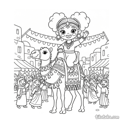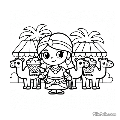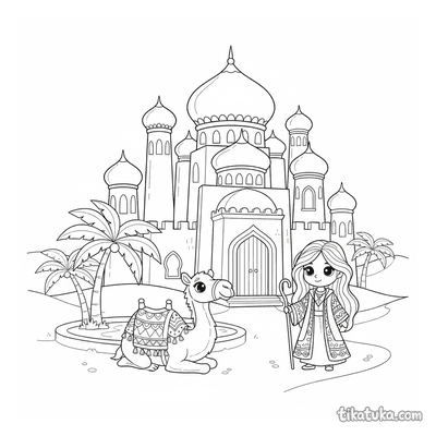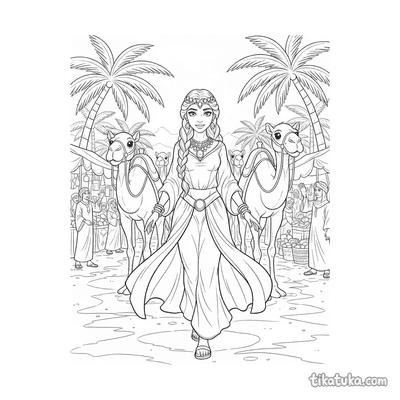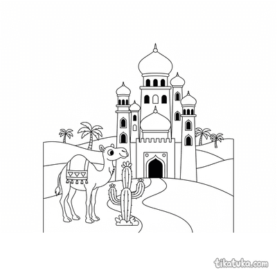 В этой подборке собраны сцены с путешественниками у дворцов с куполами, караванами, следующими к оазисам, и пустынными принцессами, ведущими своих верблюдов. Каждая картинка рассказывает небольшую историю о жизни в песках. Все 12 раскрасок с верблюдами доступны для бесплатной загрузки в формате PDF, что удобно для распечатки целой тематической подборки сразу. Четкие контуры на белом фоне хорошо подходят как для карандашей, так и для фломастеров, а также для раскрашивания прямо на сайте.