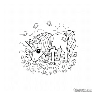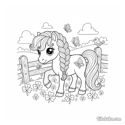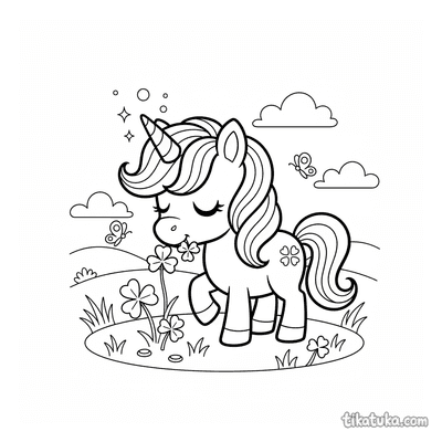 Здесь вы найдете сцены, где клевер служит мягкой подстилкой для дремлющего жеребенка-единорога или целым лугом для прогулок пони с заплетенной гривой. На раскрасках изображены единороги в волшебном лесу, кудрявые ягнята на лугу и даже морские свинки с цветами — все эти сюжеты объединены мотивом клевера.