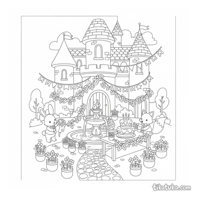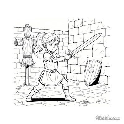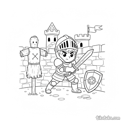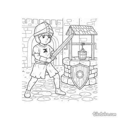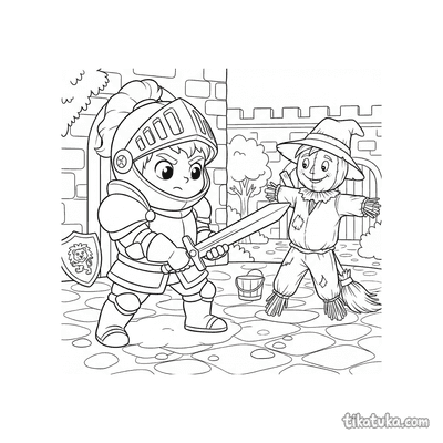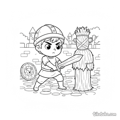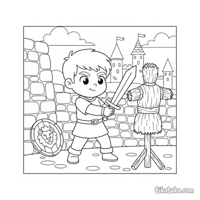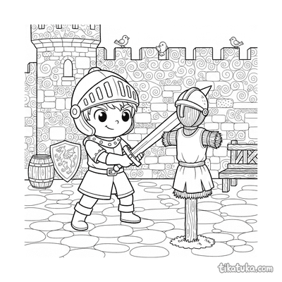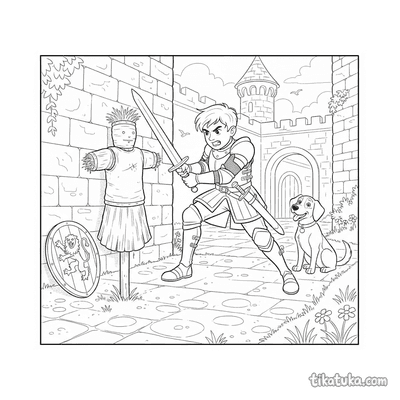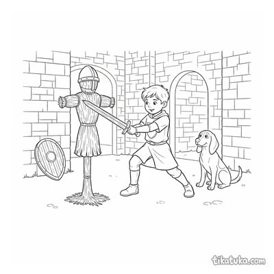 В этой подборке вы найдёте сцены из жизни двора: юный рыцарь тренируется с деревянным мечом у замка или со страшилой, а мальчик-жонглер отрабатывает трюки со светящимися шарами. Щенок далматина гоняется за пузырями, а другой щенок — за собственным хвостом, создавая динамичные и забавные сюжеты для раскрашивания.