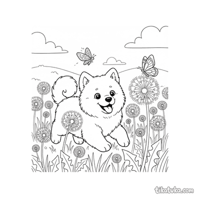 Пушистый щенок самоед в одуванчиках