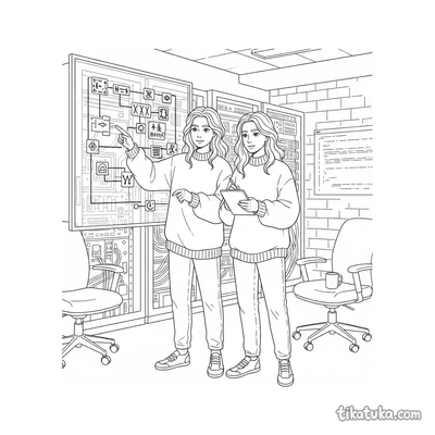 Дети найдут ботанический чертёж пиона, сцены с хакерами у маркерной доски и волонтёром, показывающим температурную таблицу. Все 18 изображения выполнены в характерном схематичном стиле с четкими контурами. Эти черно-белые схемы удобно распечатать для занятий в классе или дома. Контуры рисунков специально сделаны четкими, чтобы их было легко раскрашивать карандашами или фломастерами, развивая внимание к деталям.