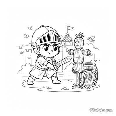 Мальчик-рыцарь тренируется с соломенной мишенью