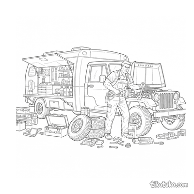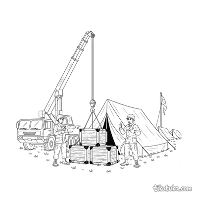 В этом разделе собраны раскраски, где показана работа полевого штаба. Здесь есть водитель у джипа, механик, проверяющий вертолет, крановый грузовик, разгружающий ящики, а также радиофургончик, мастерская на колёсах и грузовик с припасами. Сцены включают разведывательный квадроцикл и бензовоз у склада. Все 12 картинки имеют четкие контуры, что удобно для юных художников. Вы можете скачать их одним архивом для быстрой печати целой серии или раскрашивать сценарии прямо на сайте.