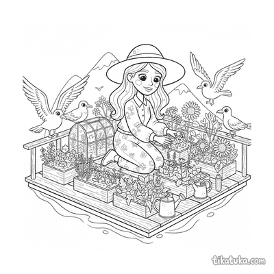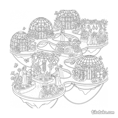 Среди раскрасок вы найдете плавучие сады с теплицами на морских платформах, девочку-садовника, а также детализированные платья с цветочной и плющевой вышивкой в стиле ар-нуво. Есть и сказочные мотивы, например, Емеля, едущий на печи, или домовой, греющийся на печке. Все изображения посвящены теме теплицы как места, где растут цветы и зелень. Вы можете скачать все 14 раскрасок с теплицей одним архивом для удобства или распечатать каждую по отдельности. Четкие черно-белые контуры без фона помогут юным художникам не выходить за линии и аккуратно раскрашивать сложные элементы вроде переплетений плюща или архитектуры плавучего сада.