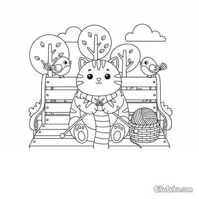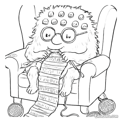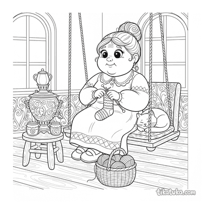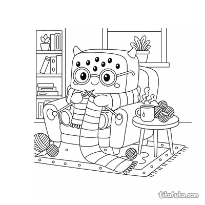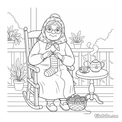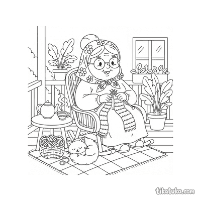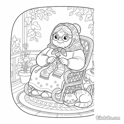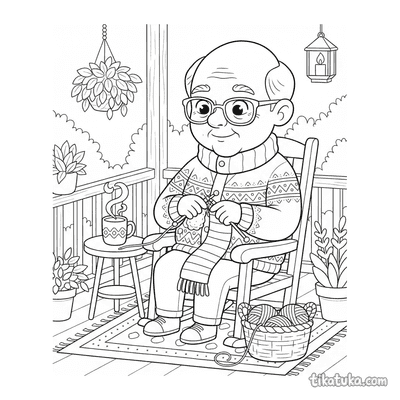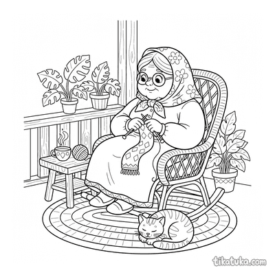 В этом разделе собраны раскраски про вязание: бабушка вяжет на веранде, дедушка — в кресле-качалке, а рядом появляются кошка со спицами и даже квадратный монстр с длинным шарфом. Сюжеты передают спокойную атмосферу рукоделия и домашнего уюта.