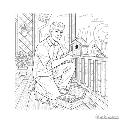 Мужчина чинит скворечник на перилах веранды
