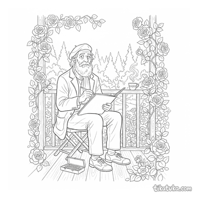 Мужчина рисует пейзаж с веранды