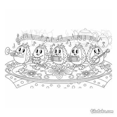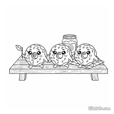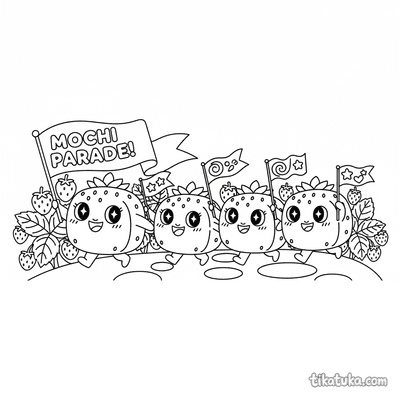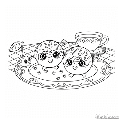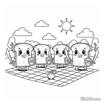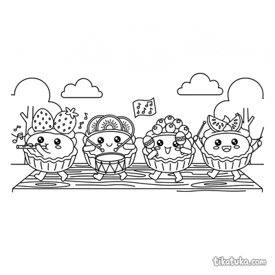 В этих сценах маршируют не солдаты, а аппетитные пончики, ломтики тоста, чашки чая и шарики мороженого. Вы увидите, как тосты-солдатики чётко шагают по тарелке, а фруктовый тарт дирижирует целым оркестром на пикнике. Дуэт онигири гордо несёт флаг из водорослей, а улыбающиеся боба-стаканчики и друзья-пончики весело маршируют по столу. Все 10 раскрасок можно скачать одним архивом для удобной печати целой серии. Чёткие контуры и простые формы делают эти черно-белые картинки идеальными для детского творчества — их легко раскрашивать как карандашами, так и красками, не выходя за границы.