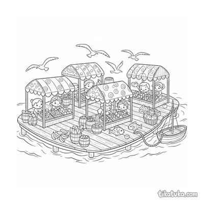На странице представлены раскраски с рыночными сценами: от уютного осеннего прилавка с тыквами под зонтами до экзотического плавучего рынка на море. Дети найдут здесь грузовики с товарами, баржи с цветами, кавайные фрукты на лотках и даже верблюдов в пустыне. Все картинки имеют чёткие контуры, что удобно для раскрашивания карандашами или фломастерами. Вы можете скачать любую раскраску отдельно или распечатать сразу несколько, чтобы создать собственную яркую рыночную галерею.