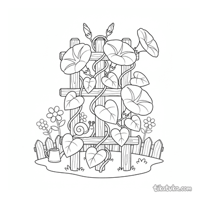 Ипомея — это вьющееся растение с красивыми цветами-граммофончиками. На этих раскрасках она обвивает садовые решетки, шпалеры и стены. Дети смогут раскрасить нежные листья и яркие соцветия этой лианы.