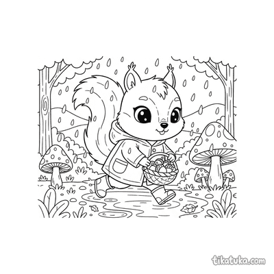 Белка собирает орехи в дождевике