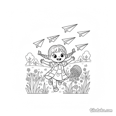 Девочка в платье из лоскутков гонится за бумажными самолётиками