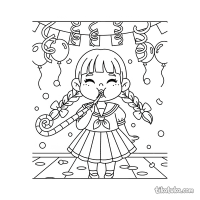 Девочка в матросском платье дудит в хлопушку