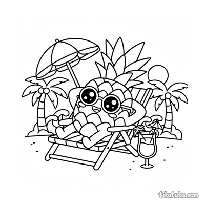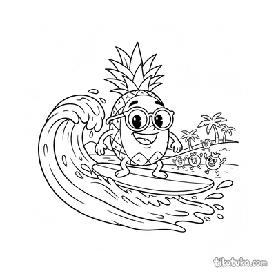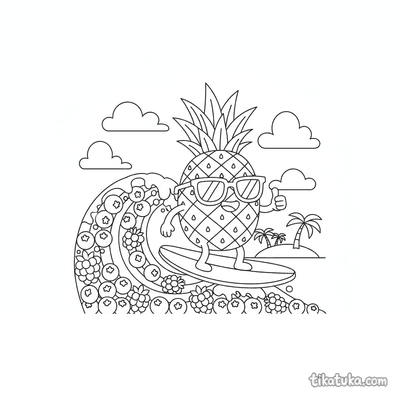 В этой коллекции ананас катается на волне сока, отдыхает в гамаке и даже жарится на гриле. Вы найдете ломтики фруктов, целые ананасы-сёрферы и сцены, где мальчики с лупой изучают его структуру, похожую на шишку. Всего доступно 16 черно-белых рисунка с четкими контурами, которые легко раскрашивать. Вы можете скачать всю подборку одним архивом для удобной печати или раскрашивать картинки прямо на сайте, выбирая цвета в онлайн-редакторе.