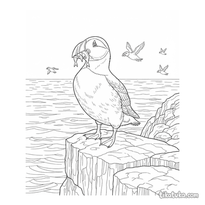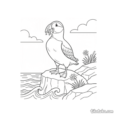 В этом разделе собраны сцены с тупиком на утёсе над океаном. Птица держит в клюве рыбу, стоит на краю скалы или доставляет забавные письма из водорослей. Каждая картинка передаёт характерный облик этой птицы. Вы можете скачать все 24 раскраски с тупиком одним архивом для удобной печати. Четкие контуры рисунков подходят для раскрашивания карандашами или фломастерами, а черно-белый фон не отвлекает от творчества.