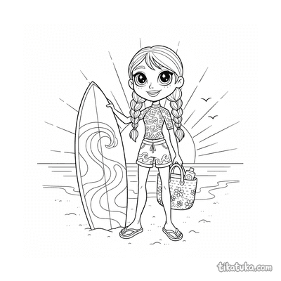 Пляжный образ серфингистки с доской и сумкой