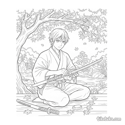 В коллекции представлены сцены из жизни самурая: ученик полирует катану под кленом, медитирует у морского утёса, водопада или в бамбуковой роще, а также практикует иайдзюцу и иайдо во дворе, иногда на рассвете. Эти сюжеты позволяют рассмотреть традиционную одежду, оружие и позы воина. Все 11 раскрасок самурая доступны для скачивания одним архивом или по отдельности. Чёткие контуры и проработанные детали делают их удобными для печати и последующего раскрашивания карандашами или фломастерами.