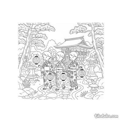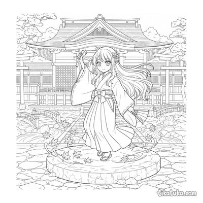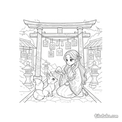 В коллекции раскрасок со святилищем представлены сцены у ворот тории, где мико исполняют танец кагура с колокольчиками, храмовницы подметают двор вместе с детьми-кодома, а лисы-кицунэ помогают в очищении. Дети найдут рисунки с семейными прогулками с фонариками у храма на закате и умиротворяющие моменты общения жриц с лисёнком.