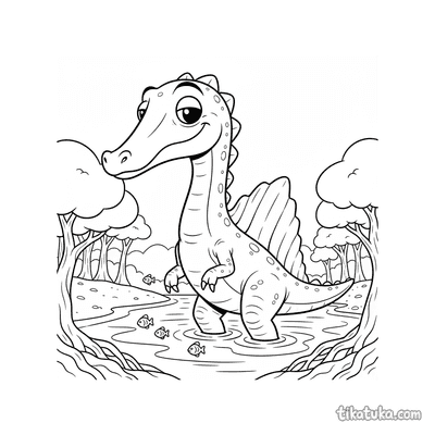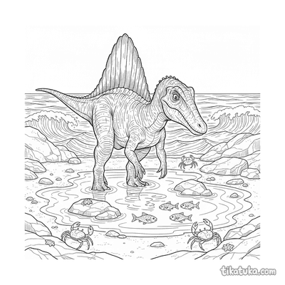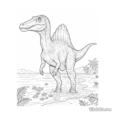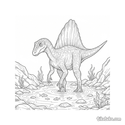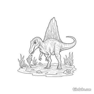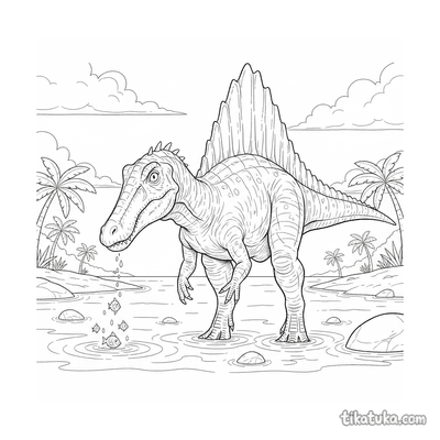 Спинозавр — один из самых необычных и узнаваемых динозавров. На этих раскрасках он изображен в своей естественной среде обитания, занятый охотой и исследованием древнего мира.