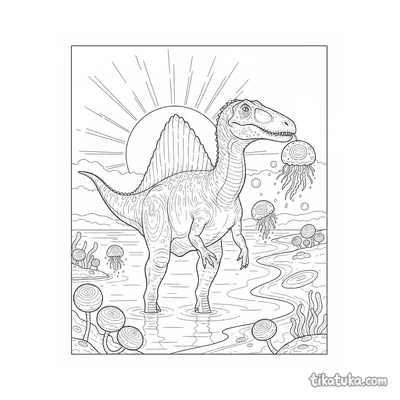 На странице собраны сцены из жизни спинозавра: он бродит по мелководью, рыбачит в лагуне среди мангровых зарослей и даже пытается поймать светящихся медуз в приливном бассейне. Каждая картинка рассказывает свою историю о жизни этого гигантского хищника. Все контуры четкие и понятные для детской руки, что делает раскрашивание удобным. Вы можете скачать любую понравившуюся раскраску со спинозавром отдельно или распечатать сразу несколько, чтобы создать целую коллекцию.