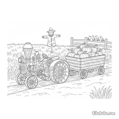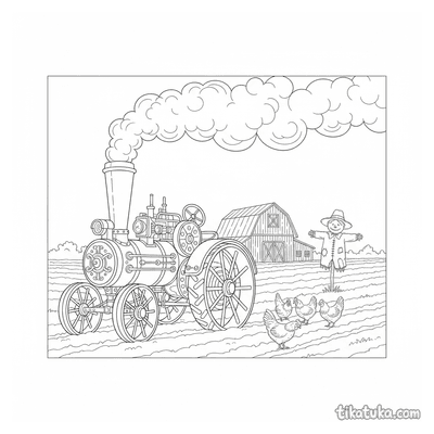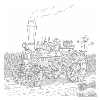 В коллекции представлены сцены с винтажными паровыми тракторами в пшеничном и тыквенном поле, на рассвете и с фермерами. Есть изображения парового катка на мостовой, трактора-ходунка и даже фантастическая сцена с паровой субмариной у кораллового рифа. Каждая раскраска передает дух старинной техники и сельской жизни.