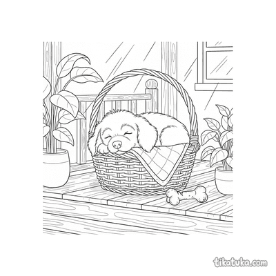 Сонный щенок в корзинке на ступеньках веранды