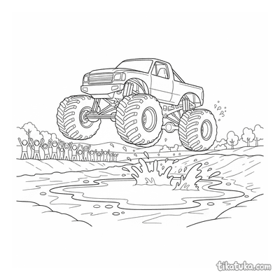Монстр-трак прыгает через лужу
