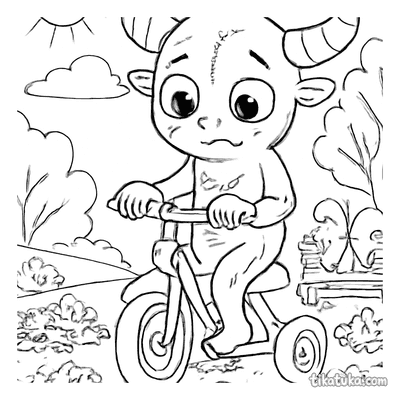 Высокий шаткий монстр учится кататься на трёхколёсном велосипеде