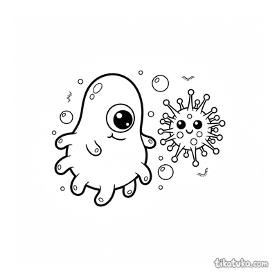 На странице собраны сюжеты с танцующими вирусами со спайками, бактериофагами, приземляющимися на бактерии, и вирусами-почтальонами. Есть сцены, где бактерии играют в футбол или перетягивание каната с вирусами, а также милые амебы и вирусы в очках на самокате. Все картинки имеют четкие контуры, что удобно для раскрашивания карандашами или фломастерами. Вы можете скачать любую раскраску отдельно или распечатать несколько листов сразу, чтобы создать свою собственную коллекцию рисунков про микромир.